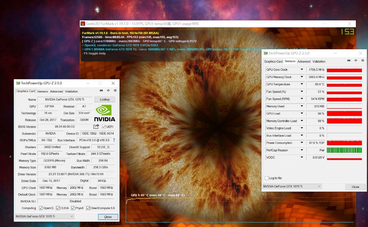 而通过Furmark满载烤机测试之后,显卡温度稳定在了63℃,此时风扇转速为1807RPM,虽然算不上测试中最强成绩,但满载之后索泰GTX 1070Ti的表现还是较出色的。