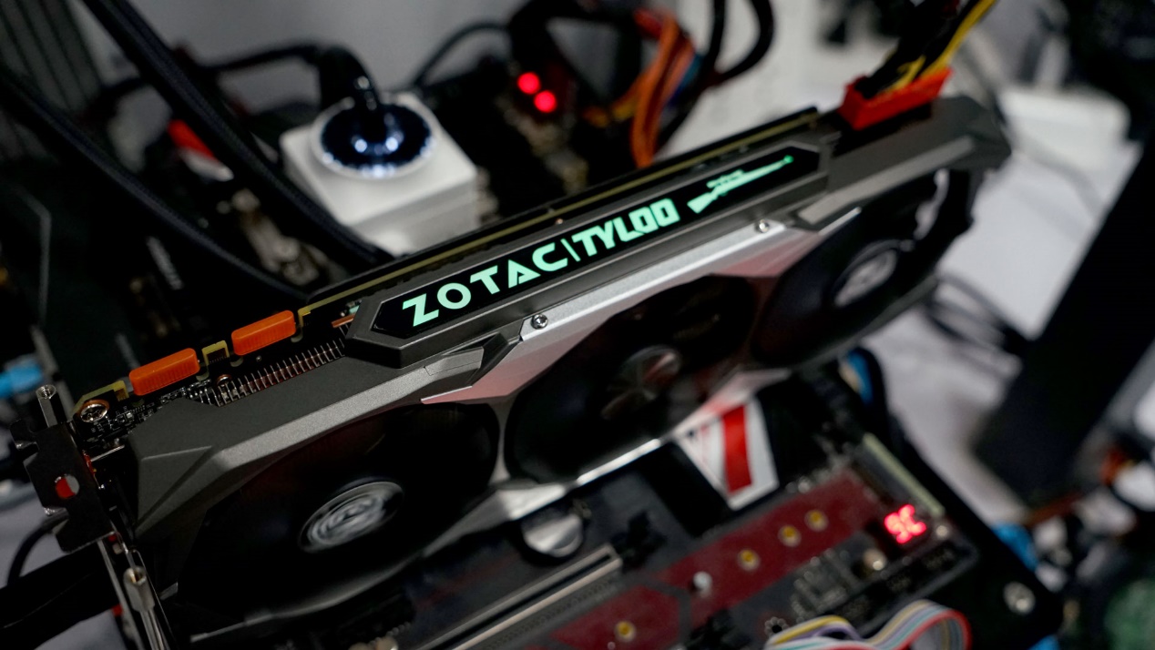 显卡上机后,可以看到顶部亮起的灯光,当然如果未来索泰能够在驱动中根据玩家游戏角色的实时情况变换显卡灯光,效果将会更加出色。