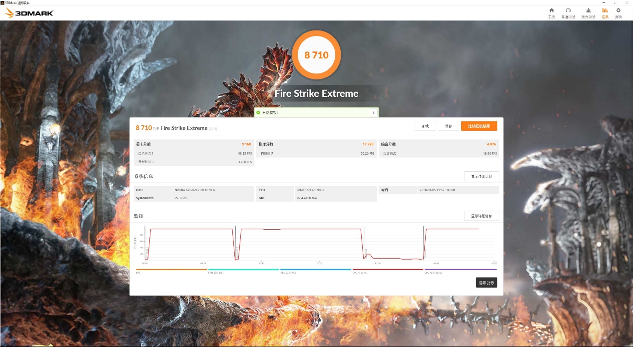 在测试之前,笔者先行贴出公版GTX 1070Ti的3DMark Fire Strike成绩,以方便下文对比。