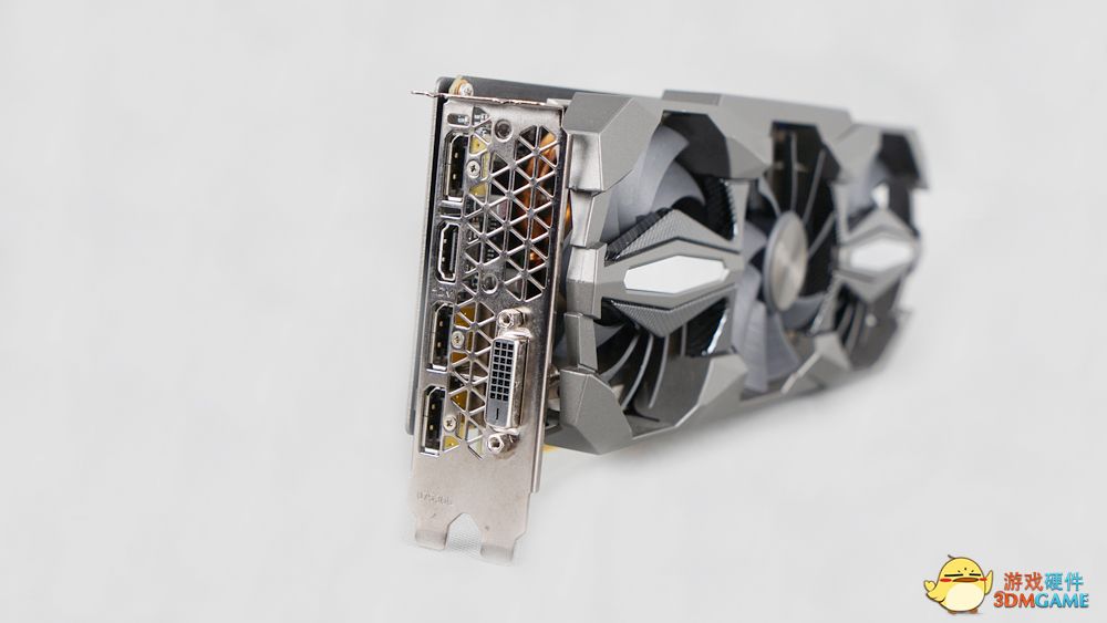 显卡的背面采用的是一整块金属背板构成,不仅如此这背面也相当有看点,由索泰首创的“3Dstorm 立体散热引擎”,玩家们可以采用索泰定制版小风扇安装在背板镂空部分的两侧,而小风扇供电只需插在显卡上方部分就可以进行更给力的散热了。