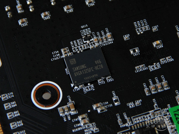 显存方面采用了来自三星的颗粒,单颗为32bit/512MB的规格,一共四颗组成128bit位宽+2GB显存容量。