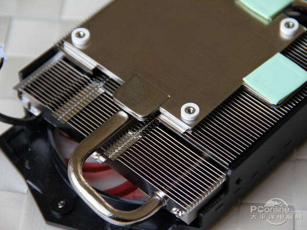 散热器部分采用的是三风扇+四热管+大面积铝鳍片的解决方案,四条热管均通过一个平整的底座与核心接触,保证了每条热管都能对热量进行有效的传导。同时底座还与一部分鳍片直接接触,热量传递效率更高。