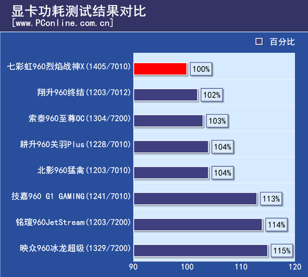 测试小结:功耗测试的结果就是个大逆转,之前取得优异成绩的映众960冰龙超级,在这里暴露出来功耗过高的问题,而之前表现与频率不成正比的七彩虹却成为了最省电的960(说不好这就是之前表现不正常的原因)。
