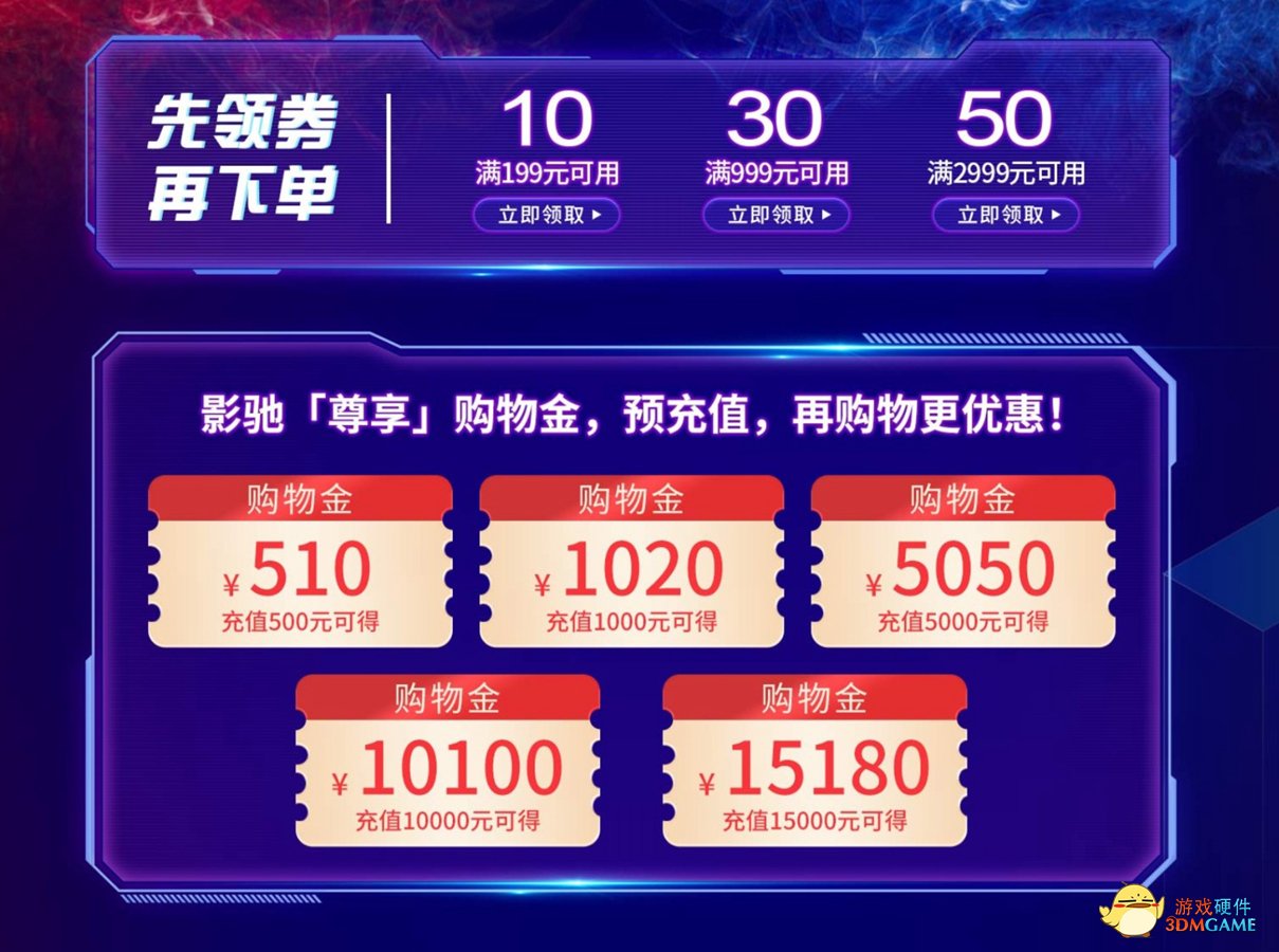 影驰日活动期间,小伙伴们可领取三种不同的优惠券,免费体会优惠乐趣。