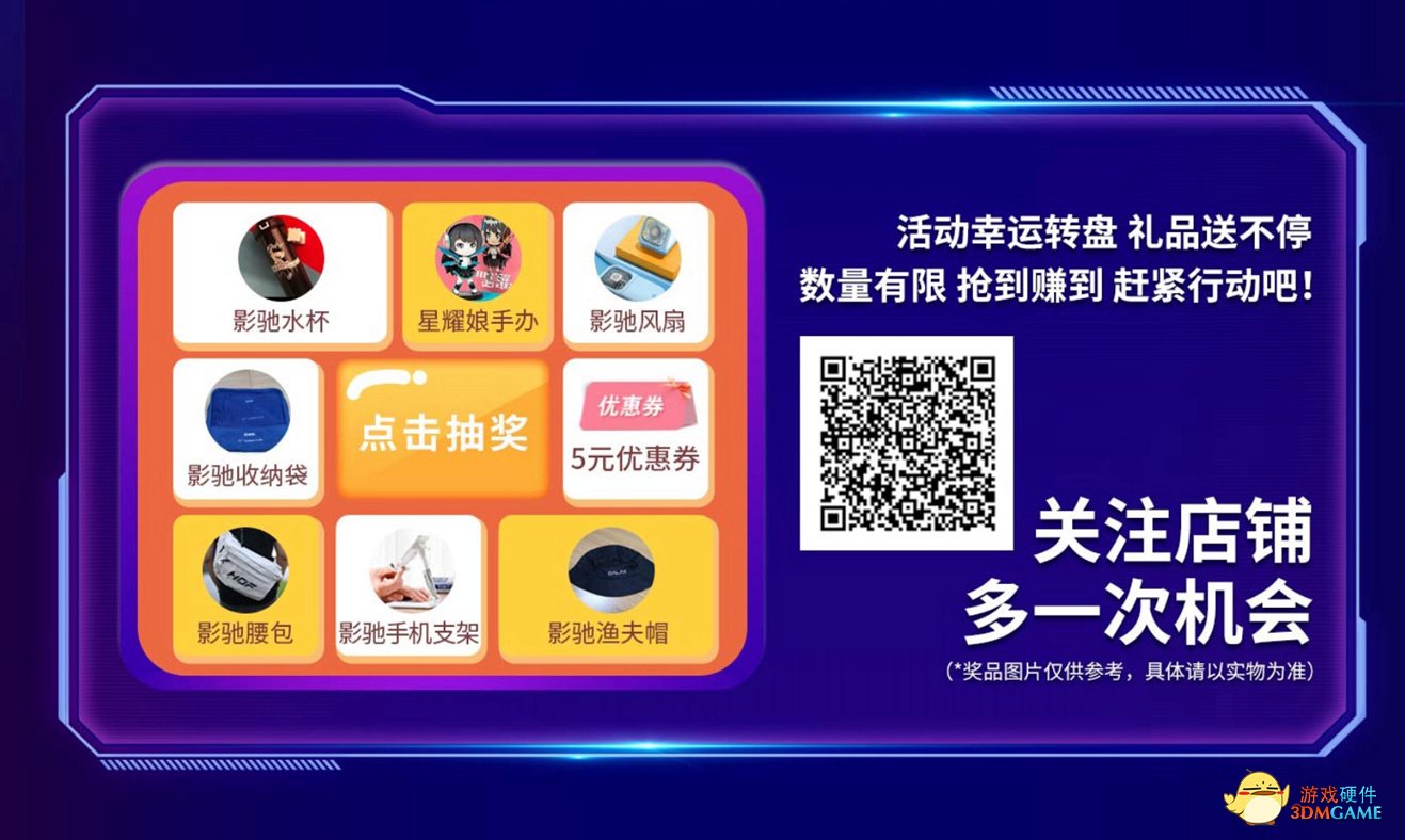 活动期间,扫码图中二维码关注影驰天猫硬件旗舰店,即有机会抽中影驰风扇、水杯、腰包,以及星曜娘手办等周边礼品。