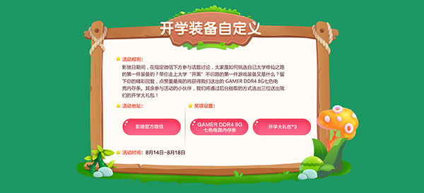 影驰日期间,在指定微信下方参与话题活动,与网友分享自己的大学第一次,呸~呸~呸,是大学玩游戏的第一件装备是什么?其中又发生了哪些小插曲让你印象深刻呢?留下你的精彩回复,点赞最高的小伙伴将获得影驰GAMER DDR4 8G七色电竞内存条一个,其余的小伙伴也不要桑心,我们将从你们当中随机抽取三位送出开学大礼包!