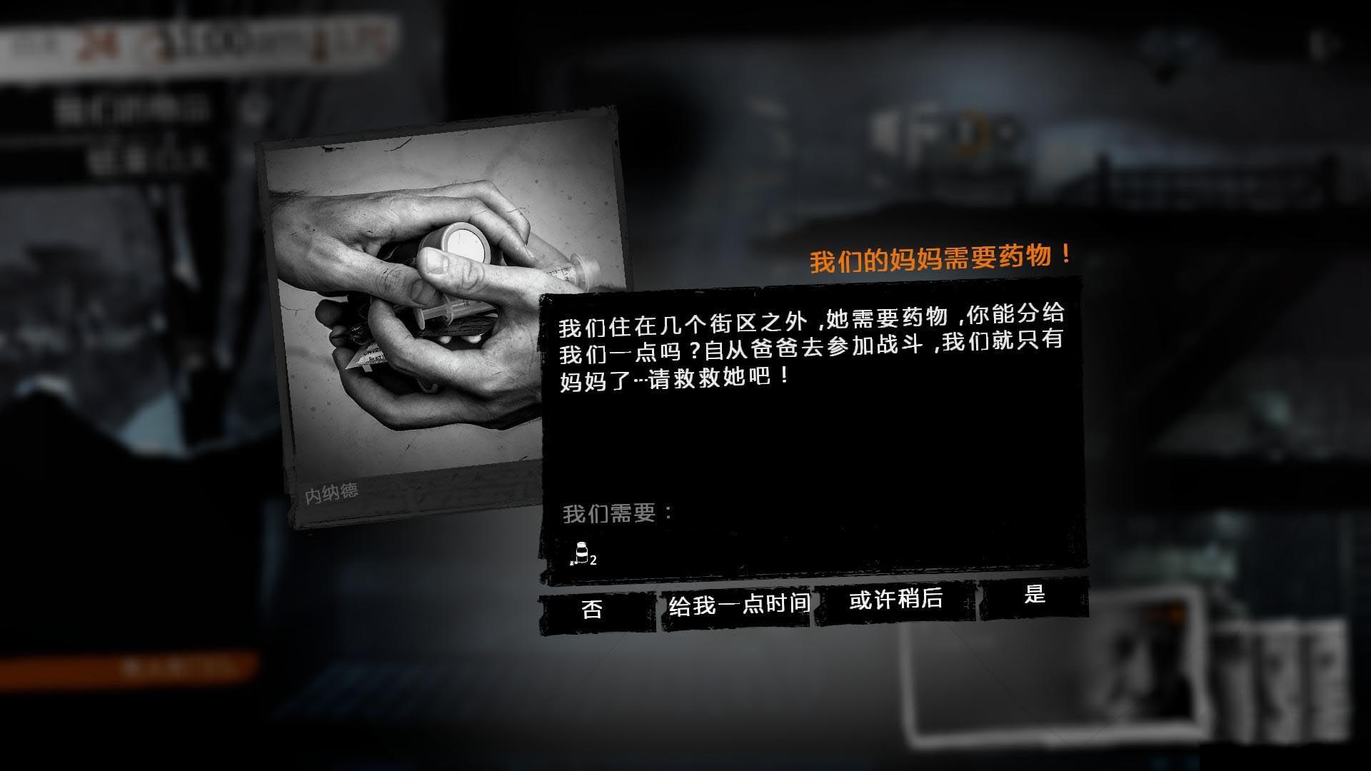 和所有的生存游戏一样,我们的生命线就维系在各种资源之上。在游戏中,构筑起了现代文明生活方式的所有资源都变得极其稀缺,食物、饮水、药品、工具都变得价比黄金。《这是我的战争》又严厉得仿佛高中教导主任,即便我们凭借着紧衣缩食和投机倒把将小窝打造得有声有色,可在严酷的环境之下,每天是否有人饿肚子的议题往往还是需要由前一天晚上出门拾荒的运气好不好来表决。而在这个已经倾覆了的水泥蚁巢内,并不是只有我们在挣扎求存。