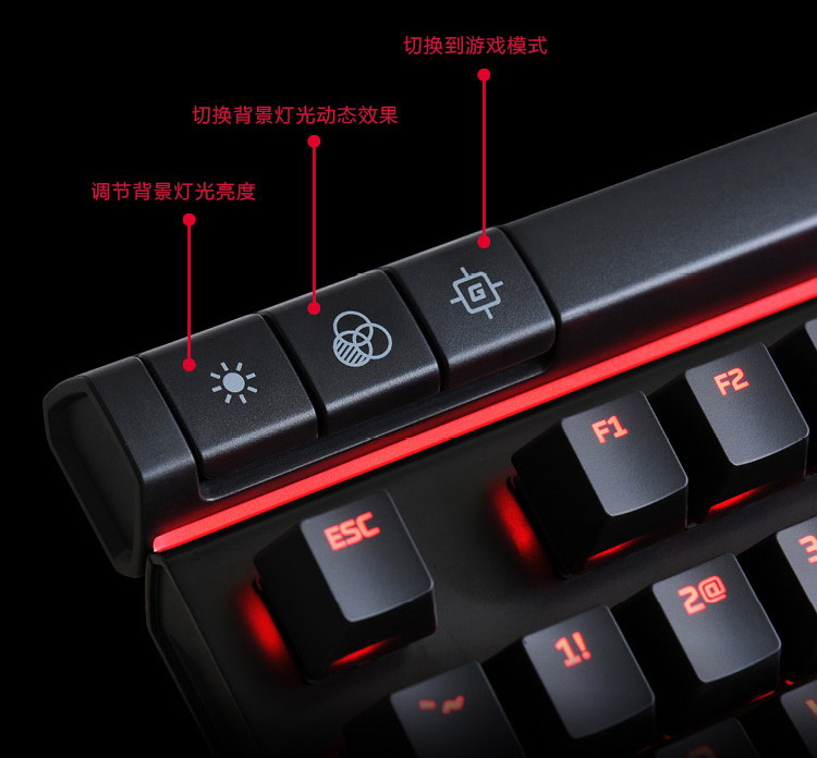 HyperX Alloy阿洛伊Elite精英版电竞机械键盘上方的左右两侧,共有8个人性化的快捷键。左侧的按键分别为:游戏模式切换键,实现全键盘无冲突;背光模式切换键,实现六种动态光效快速切换;灯光亮度切换键,实现4种亮度级别的切换。