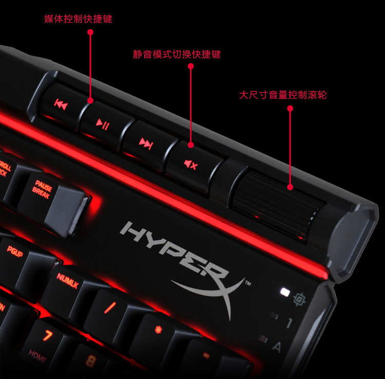 在快捷键区域的下方,采用了由18个LED灯珠组成的炫丽灯条,与键盘区域的红色背光遥相呼应,再配合6种动态HyperX背光模式,不仅能为玩家打造热血沸腾的游戏氛围,还能帮助玩家在激烈的战斗中更高效、准确地进行操作。