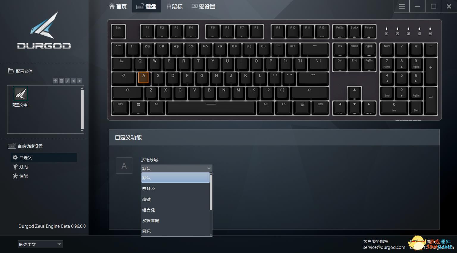 ▲我们还可以看到进入设置界面后,按键点击即可在宏命令、改建、组合键、多媒体按键、鼠标按键、应用程序打开等按键中自由编辑。总体来说功能设置可分为3大块,自定义,灯光,和性能。