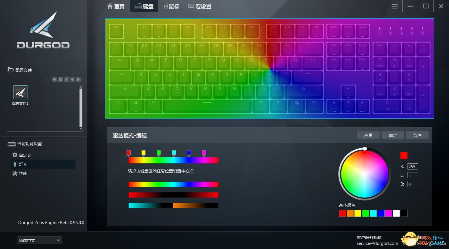 ▲同样我们可以再驱动中设置自己想要的RGB灯效,1680 万色 RGB 色彩系统任君选择,在灯光编辑中就能自定义自己喜欢的颜色,颜色丰富多彩,操作也非常简单。除了在驱动上设置外,玩家们也可以通过键盘快捷键设置,FN+ PrtSc 按键灯光模式循环切换、FN+ScrLK Nebula 七彩模式选择、通过 FN+PrtSc 切换至所需灯光模式下,使用 FN+ScrLK,则将当前的灯光模式切入 Nebula 七彩混色模式、FN+ Pause 单色选色模式(适用于所有包含单色的灯光效果模式) 、通过 FN+Print 切换到用户想要的灯光模式后,按 FN+Pause,键盘区域出现调色板,点击对应颜色按键,则将当前灯光模式切入调色板所选择的单一颜色模式。色彩循环模式下,如调用调色板选色,则进入全键盘静态单色模式 FN + Insert 打开全部灯光恢复按 FN + Delete 关闭灯光之前的灯效。 FN + Delete 关闭全部灯光当关闭全部灯光时,此时选择任何其他操作灯光之快捷键,均会使灯光重新亮起。可以说,杜伽Taurus 310 Nebula的灯光效果肯定十分赞。
