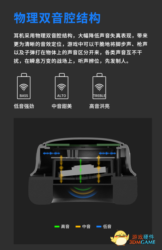 耳机采用物理双音腔结构,大幅降低声音失真表现,带来更为清晰的音效定位,游戏中可以干脆地将脚步声、枪声以及子弹打在物体上的声音区分开来,各类声音互不干扰,在瞬息万变的战场上,听声辨位,先发制人。