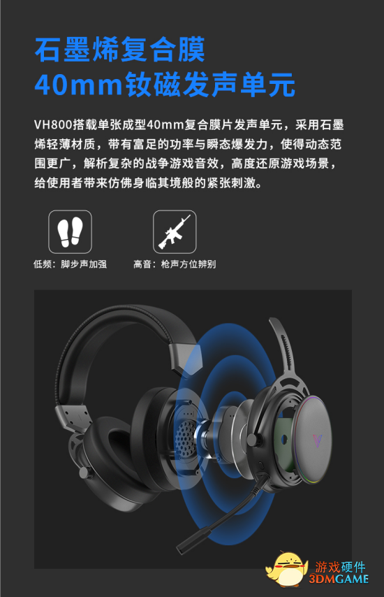 VH800搭载单张成型40mm复合膜片发声单元,采用石墨烯轻薄材质,带有富足的功率与瞬态爆发力,使得动态范围更广,解析复杂的战争游戏音效,高度还原游戏场景,给使用者带来仿佛身临其境般的紧张刺激。