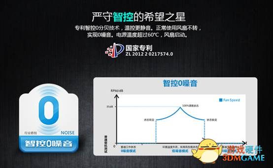 电源采用长城独有智控0噪音技术,行业首创,获得国家发明专利。其最大的特色在于节能,符合现今社会提倡的绿色环保意识。电源开启“智控0噪音”后,当电脑处于普通工作状态时,风扇将停止运转,达到真正的0噪音环境;当电源内部温度达到60°C后,风扇会自行运转,把电源内部的热量排出。