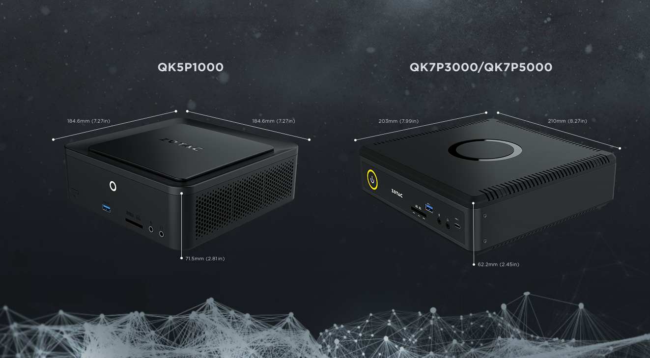 索泰ZBOX系列在迷你PC市场上人气相当高,而索泰又将推出性能更加强悍的ZBOX Q系列,而这系列相当给力,不但保持了原有的身材,甚至比传统塔式工作站小50%,可随意放置。尺寸是18.4x18.4x7.1厘米,左右两侧拥有散热孔,采用的是风冷散热的方式,而型号为“QK5P1000”