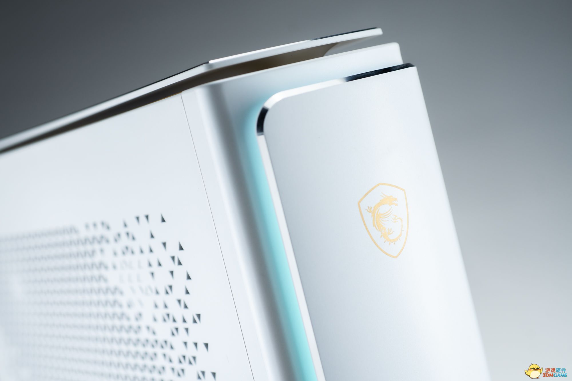 游戏主机中常见的夸张造型和侧透RGB在Prestige P100上是全部没有,整机采用了纯白的配色辅以少量淡金色点缀,各个细节处理得也十分精致。机箱两侧被必要的散热孔所覆盖,前脸的装饰灯条可以发出淡蓝色的光,非常提神,可以说是整个主机的点睛之笔。不得不说,看多了花哨的游戏主机,回头再看这种设计极尽克制的性冷淡风格,也是别有一番风味。