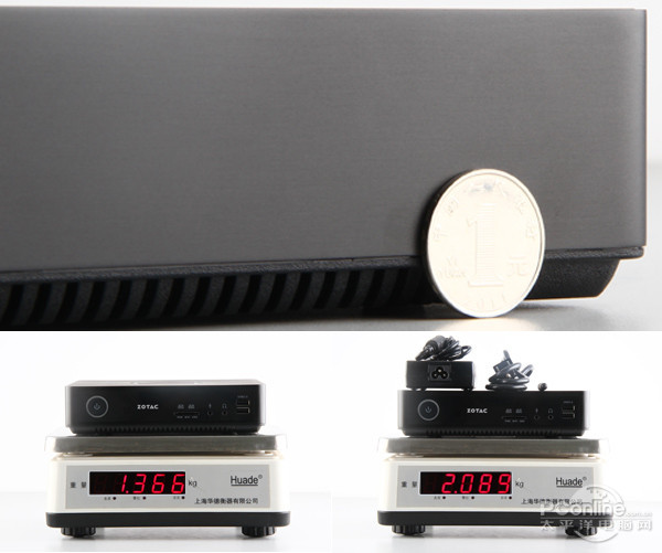 便携性方面,ZOTAC ZBOX EN970的机身重量为1.366Kg,旅重为2.089Kg,三围规格为210×203×52.5mm。相较于其它同类迷你机产品,ZOTAC ZBOX EN970可以算是大个头了,但考虑到其强劲的硬件配置以及丰富的接口设置,我们不能对它要求过高。此外,1.366Kg的机身重量以及2.089Kg的旅重,相信对于大多数用户来讲并不是问题。
