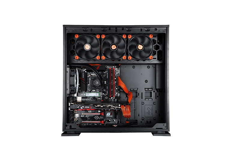 风扇采用了业界知名品牌Thermaltake风扇,配有橙色光圈的Tt风扇为整台PC增加了不少颜值,而且这款风扇在静音方面控制的十分到位,即使打开侧透板也基本听不到风扇的声音。