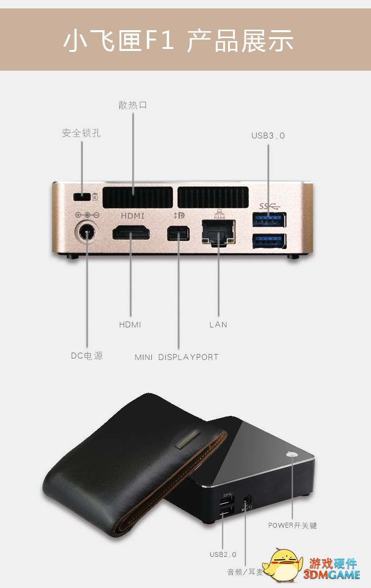 最后是小飞匣尾部扩展区,如图我们可以看到提供了两个USB3.0接口、HDMI高清接口、DISPLAYPORT数字显示接口、安全锁与电源孔。我们小飞匣搭载的显示接口HDMI与DISPLAYPORT都是当今主流高清传输方案,所以小飞匣能适配市面上几乎所有的显示器,让您走到哪用到哪!小飞匣尾部上方还拥有两个大口径的散热出风孔,保障了整体的稳定性能和运行效率。