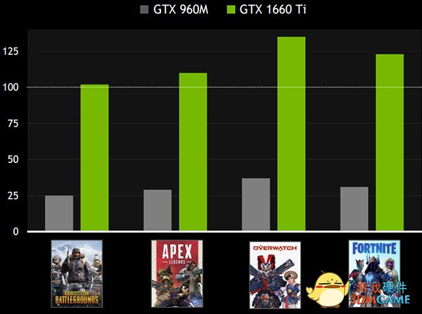 图灵架构GPU搭配6GB GDDR6显存,显存带宽得到了保证,四年前的GTX 960M游戏本在1080p分辨率和高特效设置环境运行主流《绝地求生:大逃杀》、《APEX英雄》、《守望先锋》和《堡垒之夜》显得相当吃力,而全新GeForce GTX 1660Ti游戏本则可稳定百帧畅玩上述游戏。