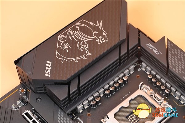 主板左侧的散热装甲设计了RGB龙魂图案,整个CPU供电MOS管也是覆盖了金属散热装甲。