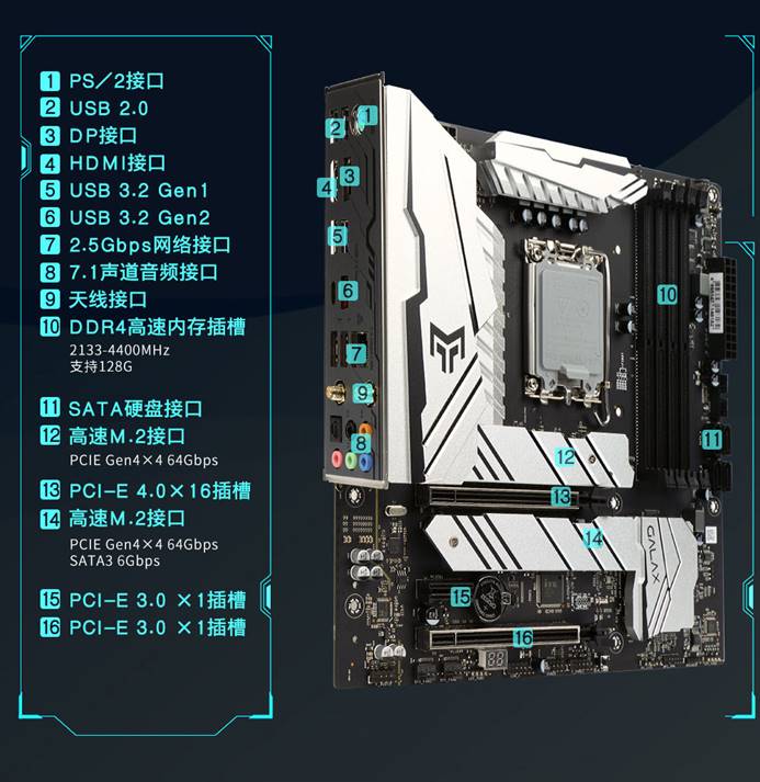 影驰B660金属大师D4主板IO接口配置丰富,配有HDMI、DP全数字接口、USB 3.2/2.0接口、7.1声道音频接口、PS/2接口、2.5Gbps网络接口,此外也预留了Wi-Fi插槽,拓展性能强劲。