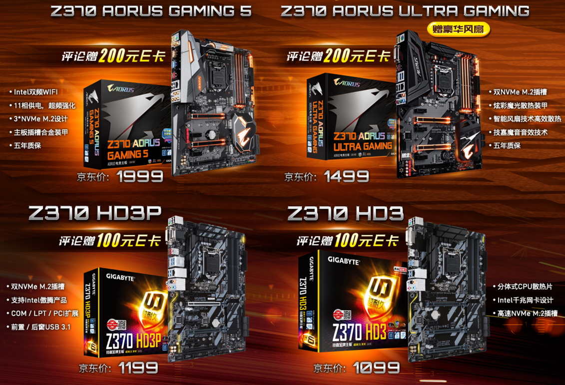 Intel第八代酷睿处理器的正式发售,可谓在IT硬件圈甚至科技圈掀起了一阵热潮。新平台大幅度的性能提升,也令许多DIY发烧友和游戏爱好者为之鼓舞。技嘉作为Intel多年的战略合作伙伴,在第一时间便给玩家带来了8款Z370芯片组主板新品。10月5日,技嘉Z370主板京东首发正式开启,Z370 AORUS Gaming 7、Z370 AORUS Gaming 5、Z370 AORUS Ultra Gaming、Z370 HD3P及Z370 HD3这5款型号首先上线。在10月5日至10月15日期间,购买指定Z370主板并且评论,即可获得最高200元E卡!赶紧点击下方链接,第一时间体验八代酷睿平台的超强性能。