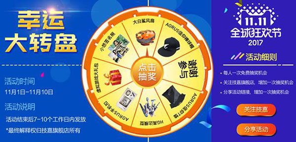 马上参与活动,技嘉双·11错峰提前购,让幸运大奖转起来吧!