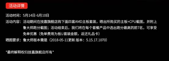 不同于以往常见的晒单抽奖活动,本次技嘉的免单活动讲究 “真功夫”:凡是购买以上介绍的四款技嘉锐龙板U套装的小伙们,在拿到手后装机晒单,并公布自己的鲁大师跑分截图,每个套餐的购买者晒单中跑分最高的前7位用户即可享受免单优惠!没错,不用靠运气,只要你有一颗DIY发烧友的心,能熟练发挥出硬件的最高性能并晒出你的跑分即可获奖,让你成为硬件DIY玩家中的“吃鸡之王”。