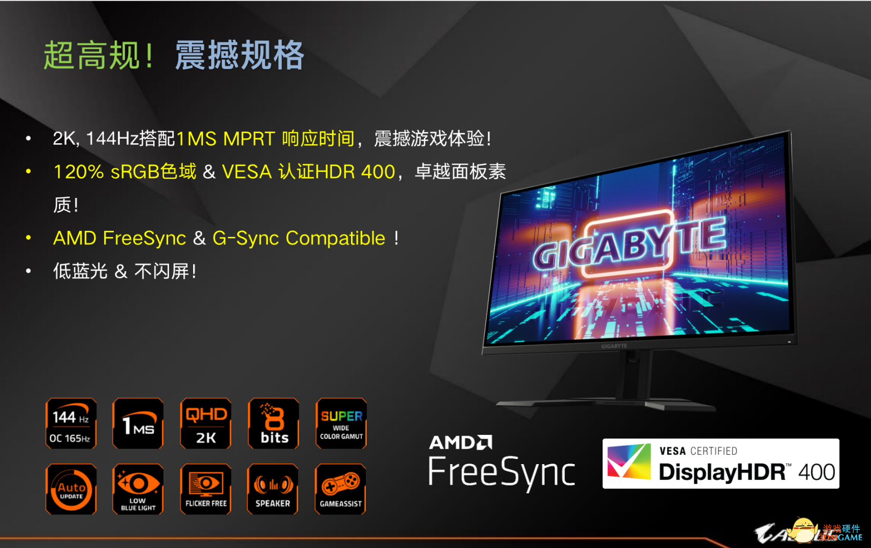 技嘉G27Q这款显示器的面板拥有144Hz刷新率和1ms的响应速度(MPRT),在游戏中能有更少的残影现象,这在FPS游戏当中会对瞄准有很大的帮助。另外其他参数方面,这块面板为原生8bit色深,覆盖了最高120% sRGB的宽色域范围,并且也通过了DisplayHDR 400认证。另外技嘉G27Q也同时支持了对高刷新率显示器非常重要的FreeSync和G-Sync技术,不论你在使用什么显卡,都能避免撕裂的情况发生。并且G27Q显示器支持低蓝光认证,可以有效降低长时间观看屏幕给眼睛带来伤害。