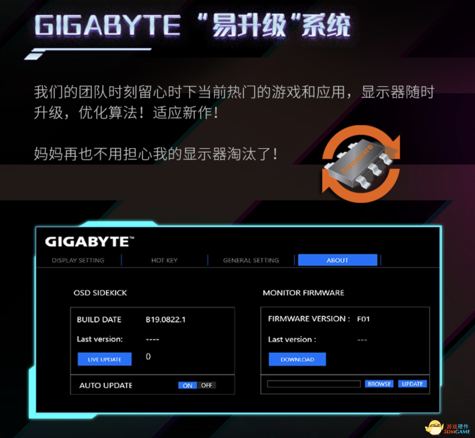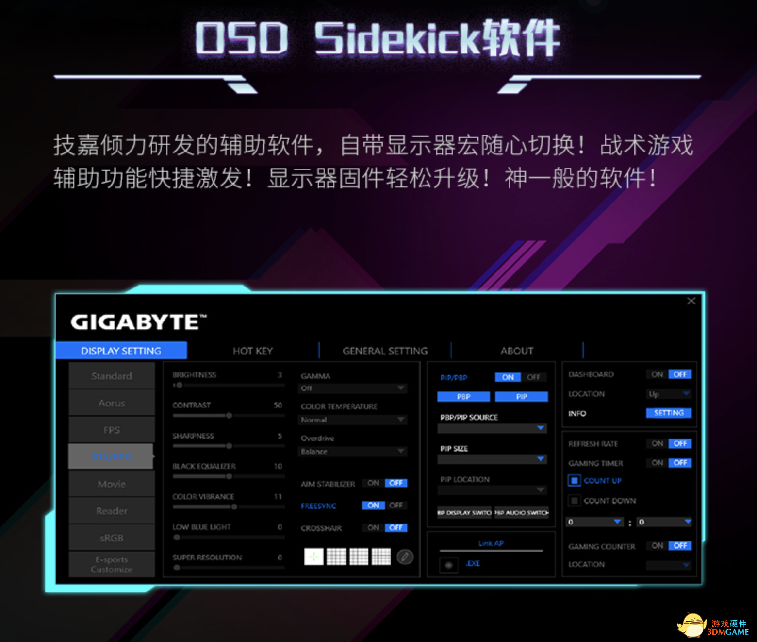 技嘉显示器家族中标志性的各种战术功能例如黑场调节、压枪辅助、屏幕准星等等功能也都统统在这台显示器上有所支持,并且这款显示器还支持后续的固件更新,技嘉团队会在后续为这款显示器带来更多更实用的功能。