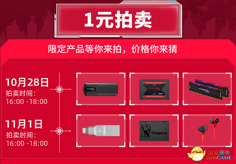 从10月28日至11月10日期间,有6天会有1元起拍活动,每天3款产品,从1元起开始拍卖,最终价高者得。