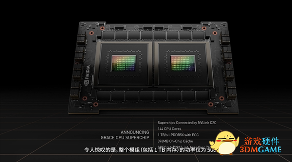 更强大的叫做Grace CPU Superchip,应该是两个而这个CPU超级芯片的规格也是相当恐怖的,两个Grac CPU封装的,总计144个CPU内核(基于ARMv9指令集),缓存容量396MB,支持LPDDR5X ECC内存,带宽高达1TB/s。