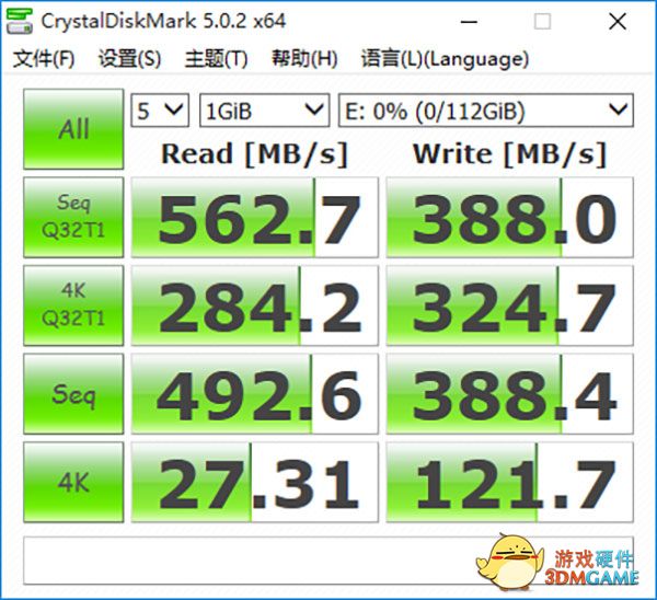 CrystalDiskMark测试软件中最大读取达560MB/s,最大写入达380MB/s。