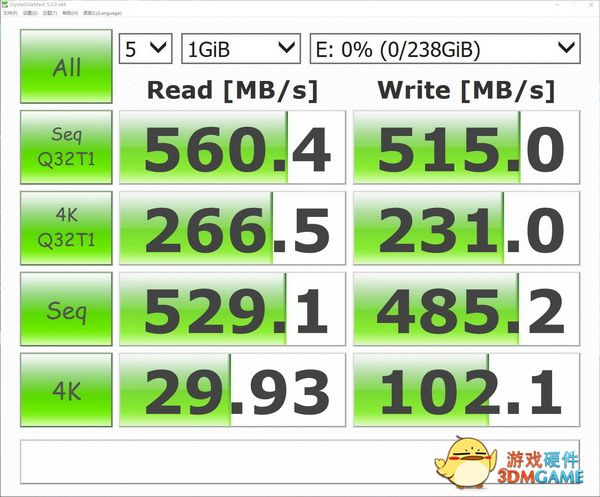 在CrystalDiskMark测试中,最大读取速度为560MB/S,写入速度为515MB/S。