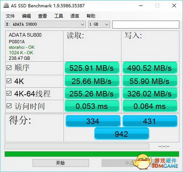 在AS SSD测试中,威刚SU800的4K成绩为读取334分,写入431分,综合得分942分。