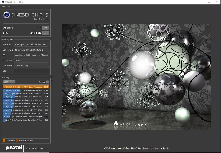 配合HyperX Predator DDR4-3333的优秀频率与时序表现,CINEBENCH R15在4.0GHz的1950X +X399平台下实现了3424的出色成绩,领先i9 7900X默频差不多59%的成绩,目前HEDT旗舰平台非这套Ryzen Threadripper+X399莫属了。