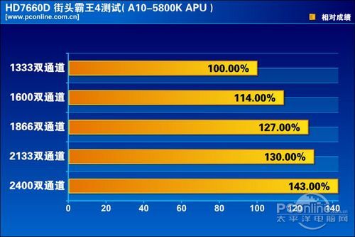 GPU对于内存带宽是非常敏感的,通常内存频率越高、带宽越大,GPU性能发挥就越好。以实际游戏性能测试来看也是这样,二代APU从1333到1866都有10%以上的性能提升,而2133相对1866改进非常小,2400又是一个性能爆发——但是很不稳定,实际上我们的测试游戏跑到最后卡死了。