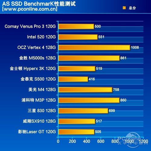 总分方面,OCZ Vertex4以1008分唯一突破千分的成绩高居榜首,而采用Marvell主控的美光M4与浦科特M3P同样给力,分别以758分与860分名列前茅。但SandForce主控阵营再次沦陷,连大名鼎鼎的Intel 520在这总分评比中都不能让人满意。