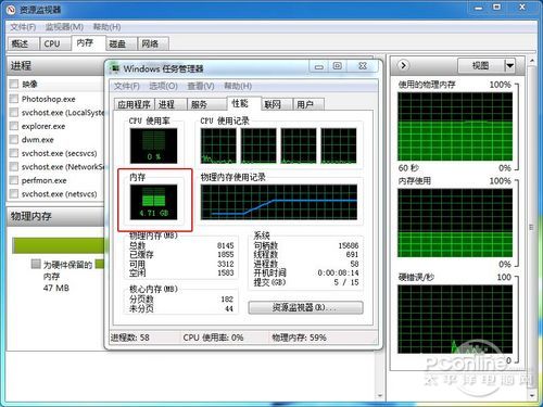 打开常见的图片处理软件Photoshop CS6,在Photoshop CS6里打开60张高清图片,再打开4个网页,瞬间内存占用达到59%,共使用了4.71G,这时4G内存就已经感觉到压力了。
