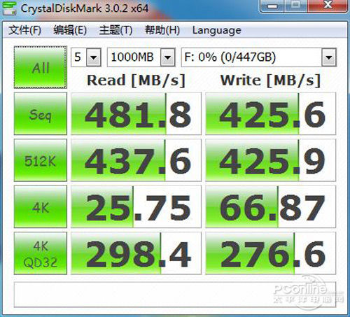 本次测试所使用的SSD为美光M500 480G,测试软件为SSD测试中常见到的CrystaDiskMark3.0.2,测试项目包括:持续读写(块单位1024KB)、512K随机读写、4KB随机读写及4K随机(QD32)读写,默认运行5次,每次1000MB的数据量,取最好成绩。