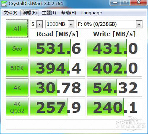 注:将mSATA接口转接为SATA 3.0接口后,接在原生SATA 3.0接口的主板上进行测试。