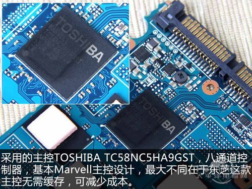 东芝THNSNHXXXGBST系列硬盘采用东芝TC58NC5HA9GST主控,这是一款东芝与Marvell合作开发的主控产品,支持八通道,但并不配备缓存颗粒。而闪存方面是该款SSD的一大优势,使用了TOSHIBA自家的19nm MLC闪存,比上一代24nm闪存,具备更强的性能,更低的功耗,更高耐久度。