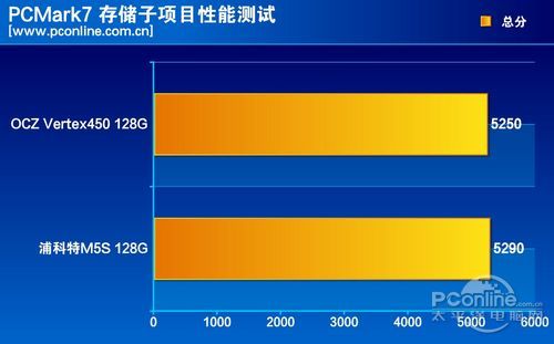 测试小结:PCMark7测试中,OCZ Vertex450 128G的得分为5250分,而浦科特M5S 128G的得分为5290分,稍微高一些。