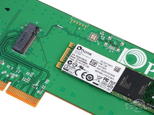 由于目前台式机上的主板均末有NGFF的接口,浦科特是通过一颗螺丝,将M6e SSD固定在一块PCI-E板上,这样就可以直接接在主板的PCI-E插槽上使用。