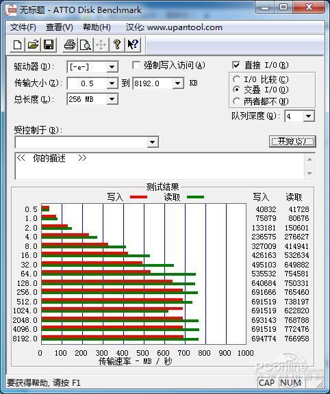 ATTO Disk Benchmark是一款简单易用的磁盘传输速率检测软件,使用了不同大小的数据测试包,数据包按0.5K、1.0K、 2.0K直到到8192.0KB进行分别读写测试,测试完成后数据用柱状图的形式表达出来,很好的说明了文件大小比例不同对磁盘速度的影响。