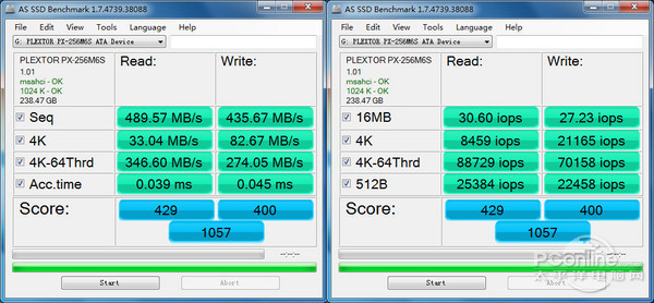 本次测试我们主要测试浦科特M6S 128G/256G SSD的理论性能以及实际应用测试,理论测试软件分别为CrystalDiskMark、ATTO Disk Benchmark 以及AS SSD Benchmark等。实际应用测试包括,Fastcopy复制传输,Windows7开机,PhotoShop CS6图片加载以及使命召唤9游戏场景加载,测试前在BIOS中开启AHCI,Trim指令,4K对齐,模拟用户的真实使用情况。