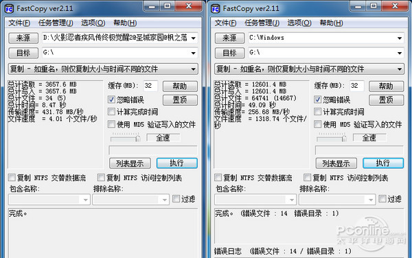 Fastcopy,是一个以优秀的文件复制工具,用它进行文件复制测试,毕竟复制操作是用户平时用得最多的写入操作之一。测试中分单个文件及文件夹传输测试,单个文件的容量为3.57G的影音文件,文件夹为13.78G的Windows系统文件(零碎文件居多),测试方法为将文件从主盘通过Fastcopy软件传输到测试盘,并计录下平均传输速度。