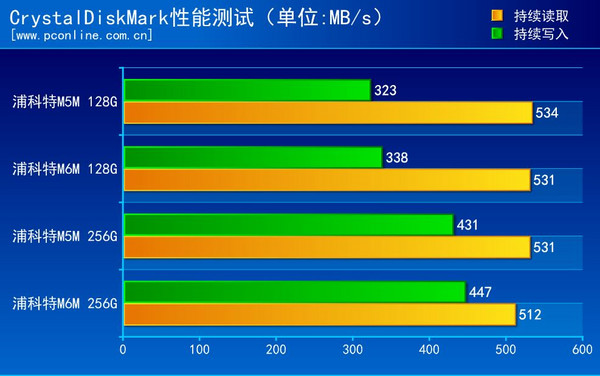 浦科特M6M 128G SSD标称持续读写达520/340MB/s,4k随机读写达90000/76000 IOPS。