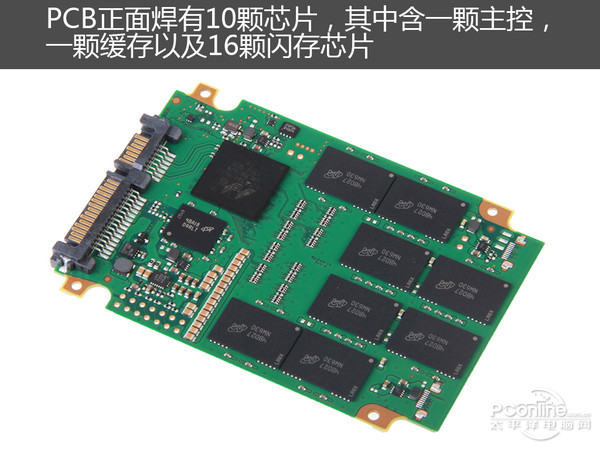 PCB正面焊有10颗芯片,其中含一颗主控,一颗缓存以及16颗闪存芯片。各元件焊点饱满,做工十分不错。